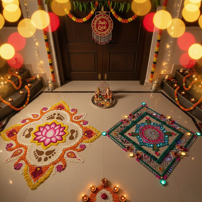 Add Festive Accessories: Surround your rangoli with torans, Shubh-Labh wall hangings, and a Kuber Yantra near your entrance to attract prosperity.
